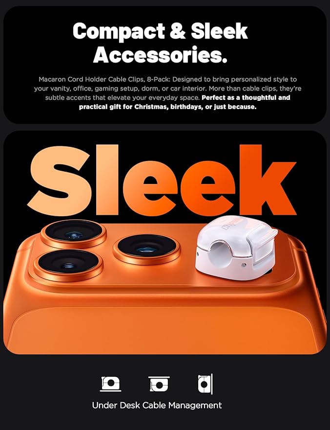 - Macaron Cord Holder Cable Clips, 12-Pack: Designed to bring personalized style to your vanity, office, gaming setup, dorm, or car interior. More than cable clips, they’re subtle accents that elevate your everyday space. Perfect as a thoughtful and practical gift for Christmas, birthdays, or just because.