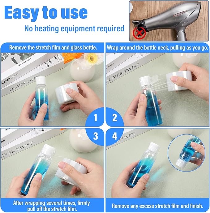 - [Versatile Container Compatibility] This shrink wrap for bottles is designed for versatile use and is suitable for sealing a variety of containers, eliminating the need to measure the diameter of the bottle opening. It effectively seals dropper bottles, oil bottles, cosmetic containers, and pickle jars. The flexible nature of stretch film allows it to conform to a variety of shapes and sizes, making it ideal for leak-proof packaging in home, kitchen, cosmetic, and commercial applications