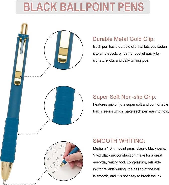 Linbsunne Ballpoint Pens Black Medium Point 1mm Pen with Super Soft Grip Ball Point Pen for Men Women Retractable Pens (Vintage-12 pcs)