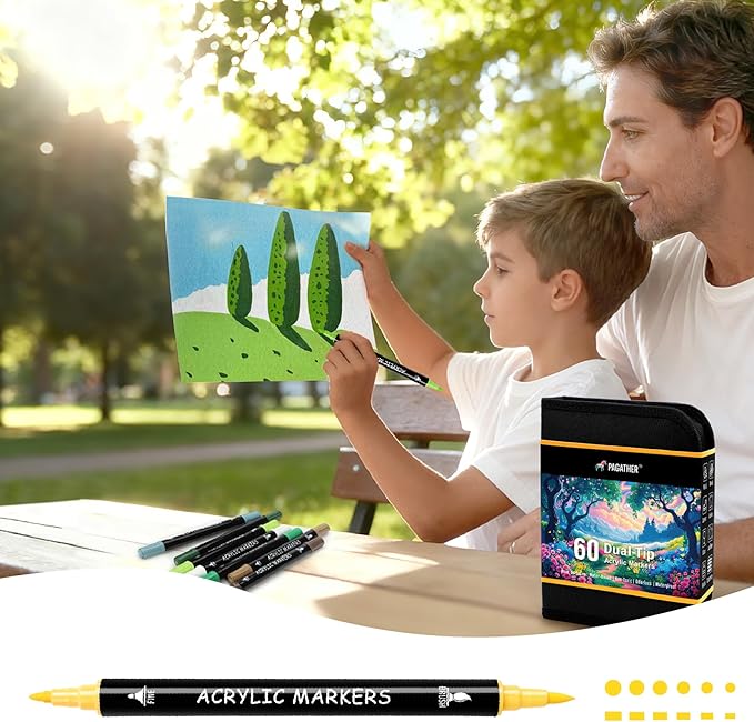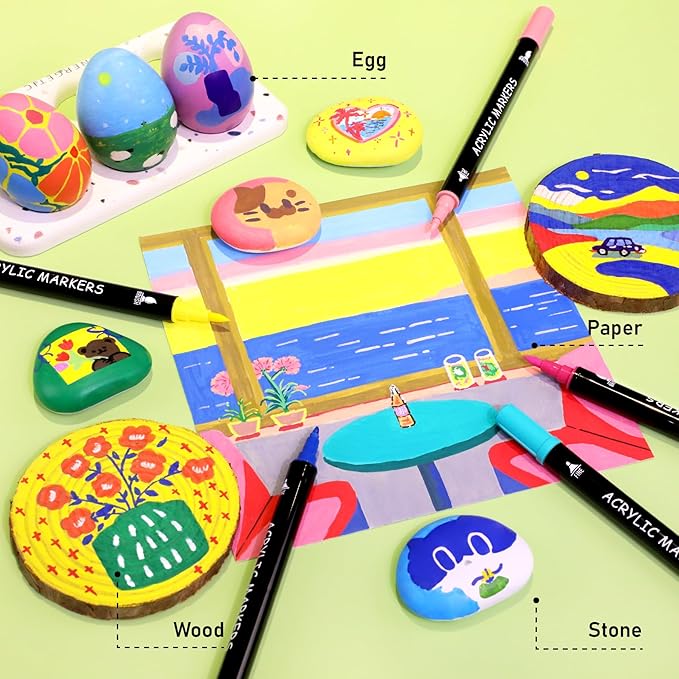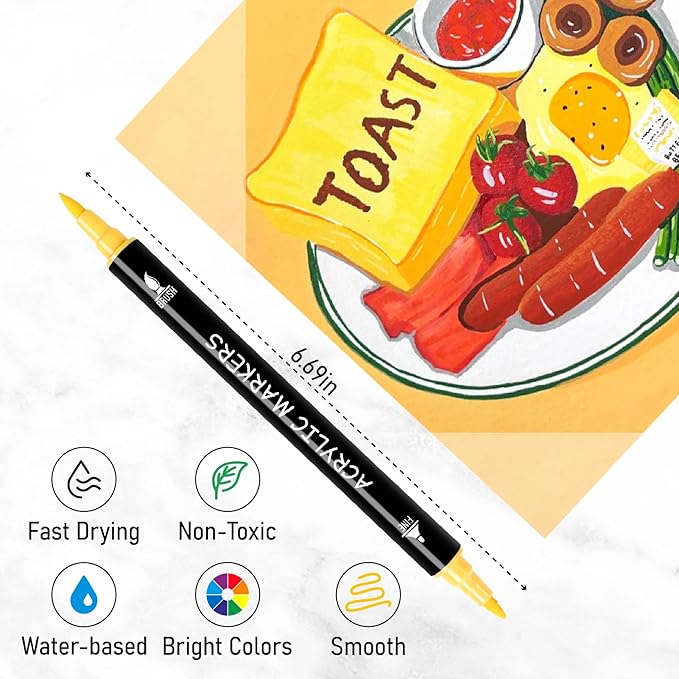 - 【Versatile Dual-Tip Design】: Unleash your creativity with our acrylic markers featuring a unique dual-tip design. The extra-fine tip is perfect for intricate details, while the brush tip allows for expressive brushstrokes. From delicate line work to bold sweeps, these markers adapt effortlessly to your artistic vision.