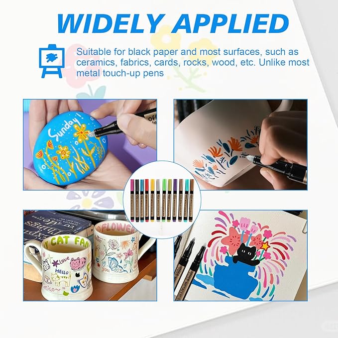 - Applications: Ideal for artists, craft enthusiasts, students, and hobbyists involved in scrapbooking, vision boards, rock painting, card making, journal decoration, and a variety of DIY art projects. These markers excel in applications where a metallic finish enhances visual appeal, such as holiday decorations, personalized gifts, home decor projects, and artistic expression on non-traditional canvases