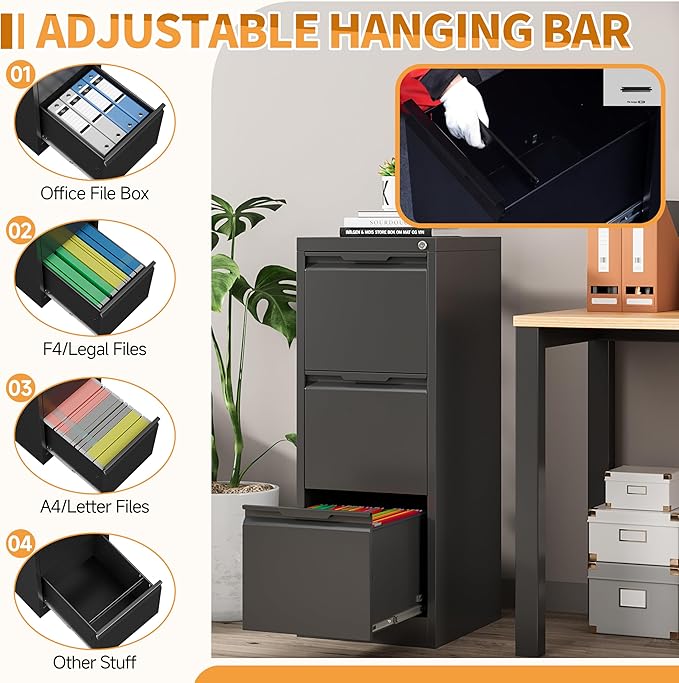 - 【Large Capacity】This vertical file cabinet for home office has large storage space, fully retractable ball bearing drawer slide rails for easy access to all folders, file drawers with adjustable hanging rods can hang A4 size, letter size or legal size hanging folders to make your files well organized.