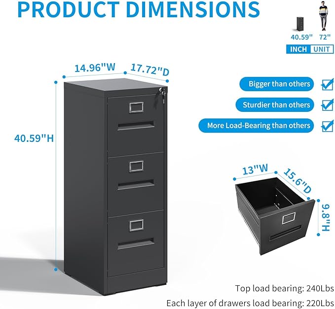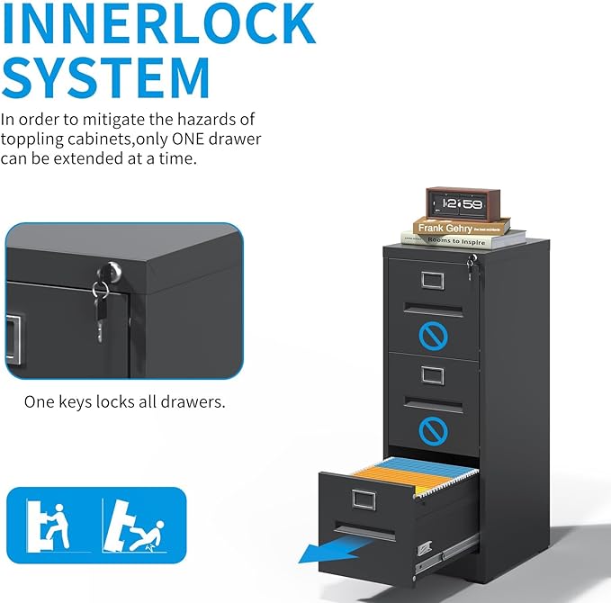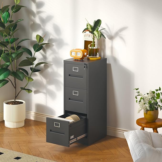 - 【Noiseless & Anti-Tipping Design】The smooth, quiet sliding rails allow for effortless and noise-free drawer operation, enabling easy access to files without disturbing others. The metal filing cabinet features a one-drawer-at-a-time mechanism that prevents multiple drawers from opening simultaneously, ensuring stability and reducing tipping risk even when fully loaded. This design keeps your files organized and safely stored.