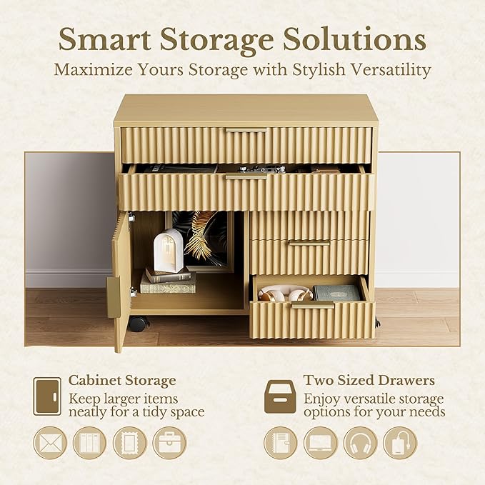 Fluted File Cabinet with 5 Drawers, Large Storage with Cabinet Door, Mobile Filing Cabinet with Locable Wheels for Home Office, Light Walnut