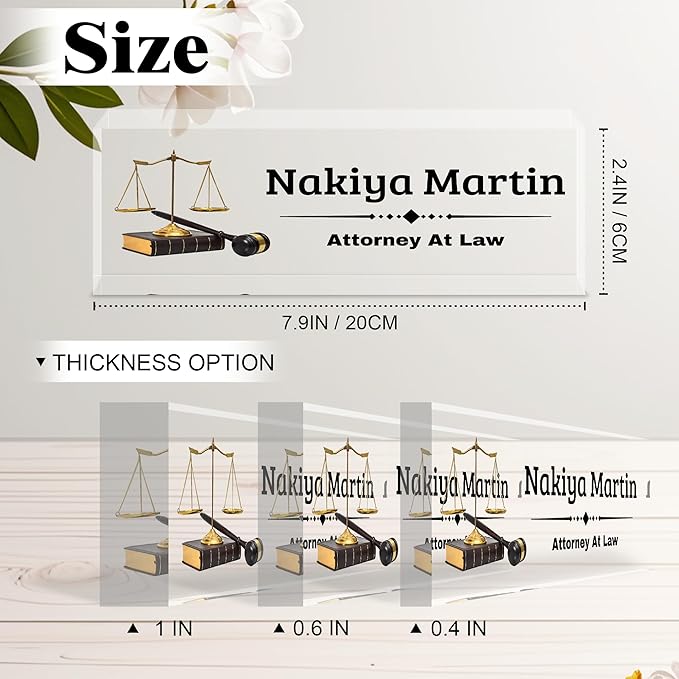 - Unique Appreciation Gift: We offer a range of designs from minimalist to classic styles, effortlessly matching the aesthetic needs of different office environments. Standard dimensions: 7.9 inches (L) x 2.4 inches (H), with three thickness options: 0.4 inches, 0.6 inches, and 1 inches. Whether used for front desk signage, executive desk, or as personal commemorative decorations, it can meet all needs.