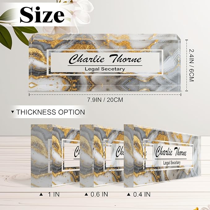 - Professional Customized Name Plate: With just three simple steps, you can have this exquisite professional name plate. Select your style and thickness, then enter the custom information(Name/Position/Blessing) to complete your custom order. We use efficient production and meticulous quality inspection to ensure that you receive this desktop name plate in a timely manner. Take immediate action to add a touch of brightness to your office space!
