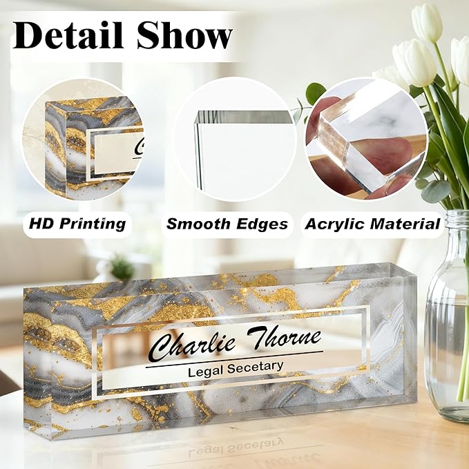- Personalized Desk Name Plate: We employ advanced UV-cured ink printing technology to ensure text and patterns remain as vibrant as new, resistant to wear, fading. The edges are polished with precise rounded corners, providing a smooth touch without sharp edges Crafted from premium high-density acrylic material, it boasts crystal-clear transparency, enduring luster, and resistance to yellowing, maintaining its pristine clarity and visual brilliance long after long term use.