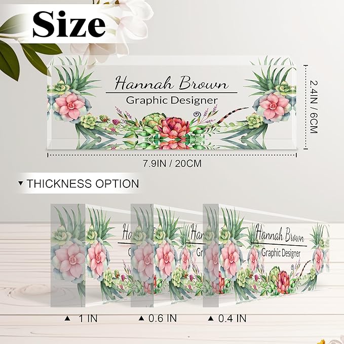 - Professional Customized Name Plate: With just three simple steps, you can have this exquisite professional name plate. Select your style and thickness, then enter the custom information(Name/Position/Blessing) to complete your custom order. We use efficient production and meticulous quality inspection to ensure that you receive this desktop name plate in a timely manner. Take immediate action to add a touch of brightness to your office space!