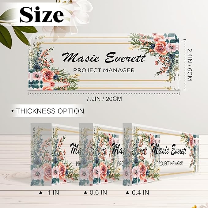 - Professional Customized Name Plate: With just three simple steps, you can have this exquisite professional name plate. Select your style and thickness, then enter the custom information(Name/Position/Blessing) to complete your custom order. We use efficient production and meticulous quality inspection to ensure that you receive this desktop name plate in a timely manner. Take immediate action to add a touch of brightness to your office space!