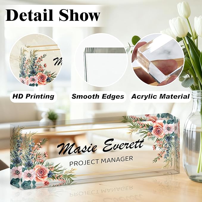 - Personalized Desk Name Plate: We employ advanced UV-cured ink printing technology to ensure text and patterns remain as vibrant as new, resistant to wear, fading. The edges are polished with precise rounded corners, providing a smooth touch without sharp edges Crafted from premium high-density acrylic material, it boasts crystal-clear transparency, enduring luster, and resistance to yellowing, maintaining its pristine clarity and visual brilliance long after long term use.