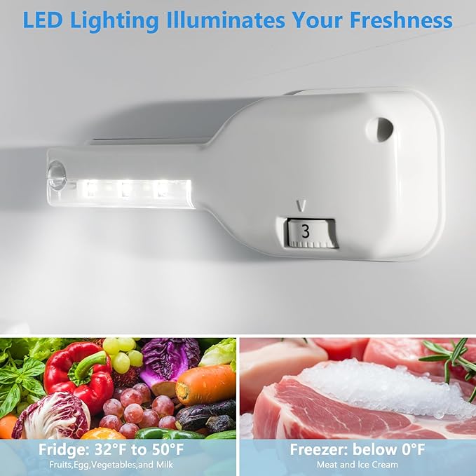 - User-Friendly Design: Led interior fridge light makes you easier to find things at night. The bottom of the refrigerators are equipped with adjustable feet, which makes it easy to adjust the placement angle of the refrigerator on uneven ground bedroom.