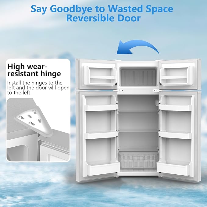 - Dual-Door Design with Your Own Freezer: Mini fridge enjoy a spacious 3.64 cu.ft refrigerator for fresh groceries and a separate 0.85 cu.ft freezer for frozen goods. This smart design organizes your food, prevents odors from mixing, and keeps everything fresh.