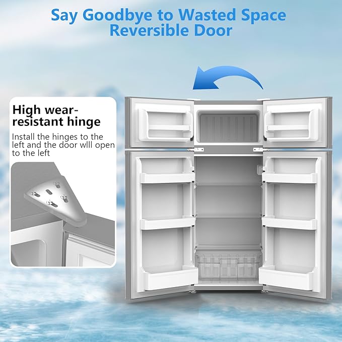 - Dual-Door Design with Your Own Freezer: Mini fridge enjoy a spacious 3.64 cu.ft refrigerator for fresh groceries and a separate 0.85 cu.ft freezer for frozen goods. This smart design organizes your food, prevents odors from mixing, and keeps everything fresh.