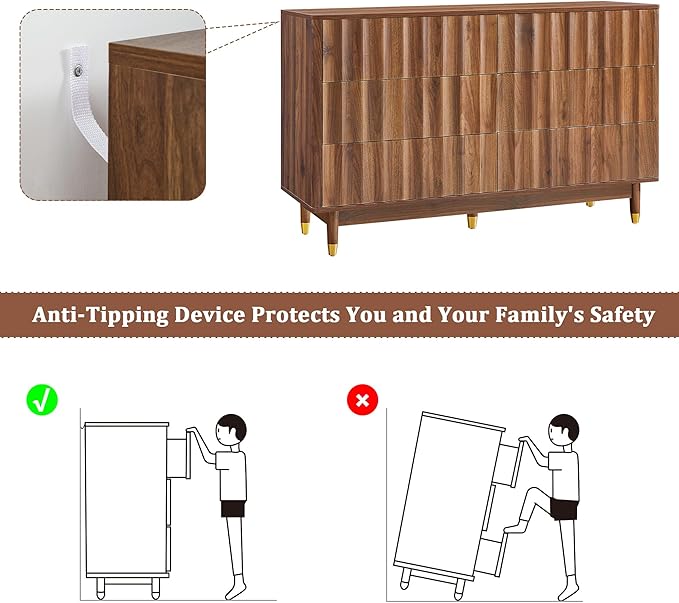 - Safe and Stable:This modern 6 drawer dressers composed of high-quality MDF, providing good stability and support. Featuring convenient Rebound Devices, each drawer opens and closes smoothly with just a gentle press, offering effortless access. It is also equipped with an anti-tilt safety belt to firmly fix the dressing table to the wall, preventing accidental tilting and enhancing safety. This combination of smooth operation and secure anchoring represents an important security upgrade, especially for families with children or pets