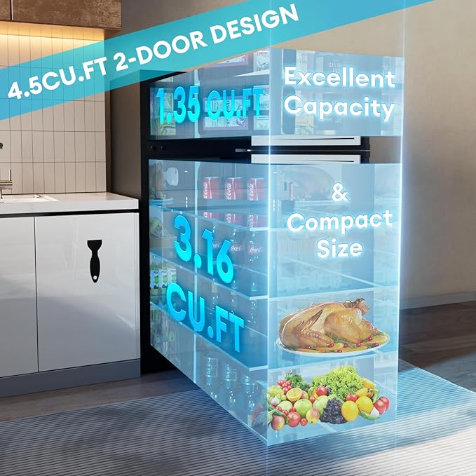 - 【Dual Cooling Zones with Large Capacity】This refrigerator features a space-saving design ideal for small spaces like apartments, offices, or dorms. Despite its compact footprint, it offers a generous 4.5 cubic feet of capacity. The convenient top-mounted freezer provides dedicated space for frozen goods, while the larger fresh food compartment keeps your daily items neatly organized and easily accessible.