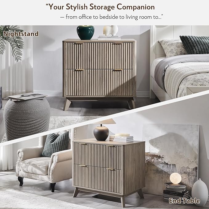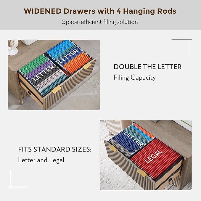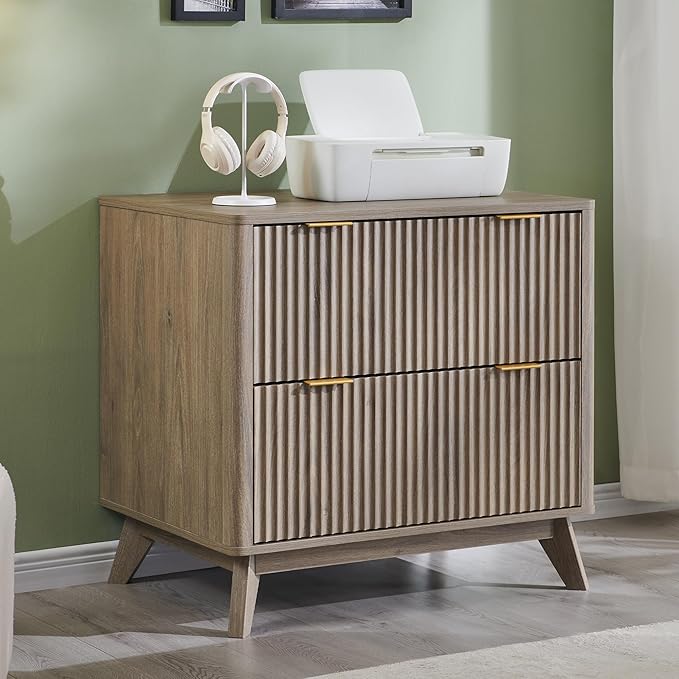 - Sleek & Modern Fluted Design: Elevate your workspace with our contemporary lateral file cabinet, featuring a sleek fluted design that adds striking depth and tactile sophistication. The rich woodgrain texture pairs seamlessly with chic metal handles, creating a perfect blend of modern elegance and functional durability. Its gently curved profile ensures a soft aesthetic, while the tapered legs provide exceptional weight distribution and rock-solid stability.