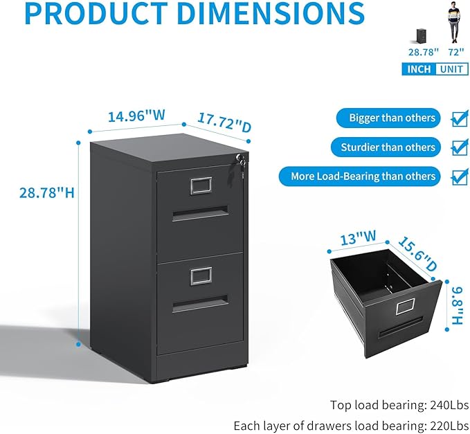 - 【Secure Locking System】Keep your confidential documents safe with this reliable locking file cabinet. Each 2 drawer file cabinet is equipped with a built-in lock and two keys, providing peace of mind and preventing unauthorized access to your important files, contracts, and records.